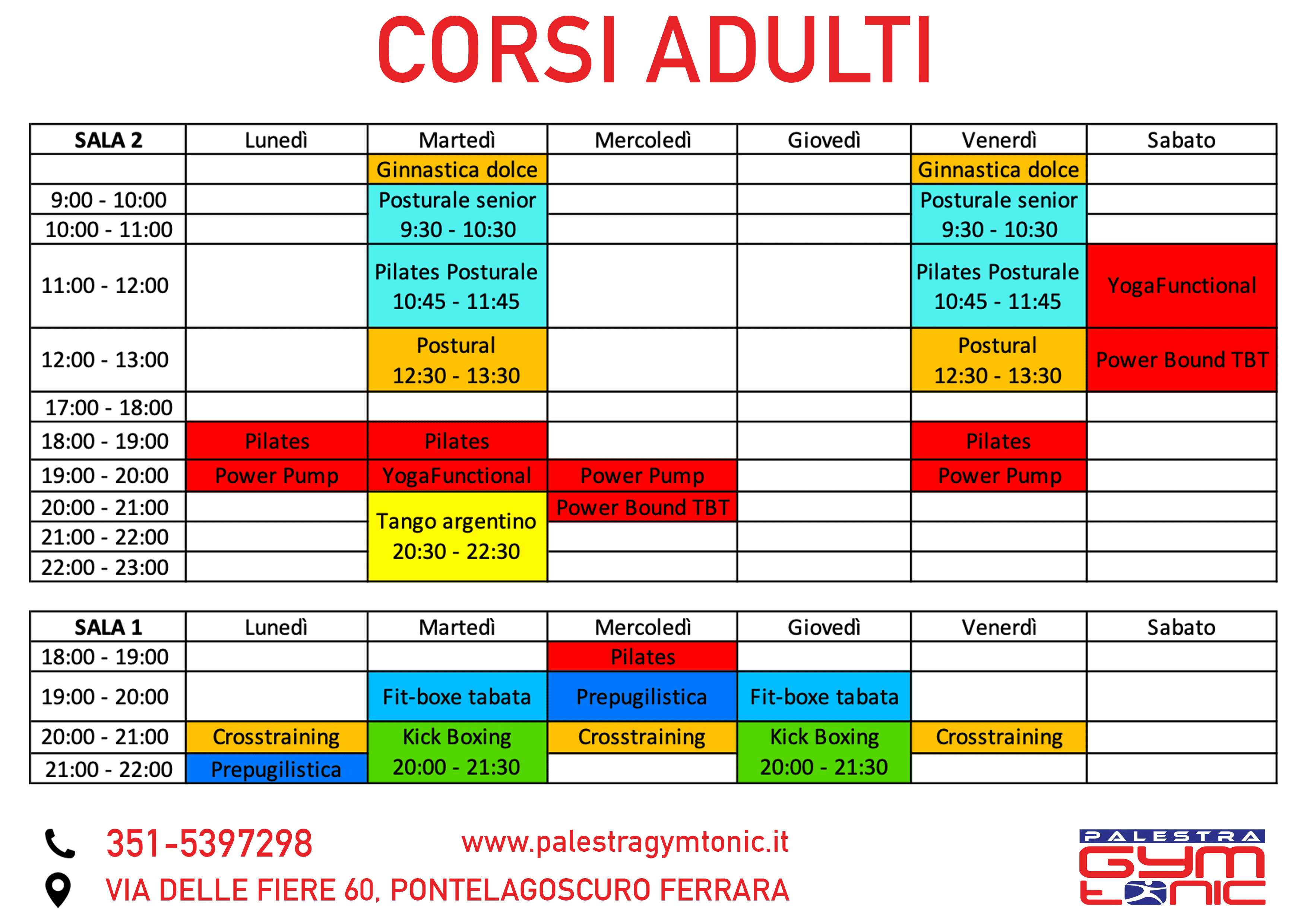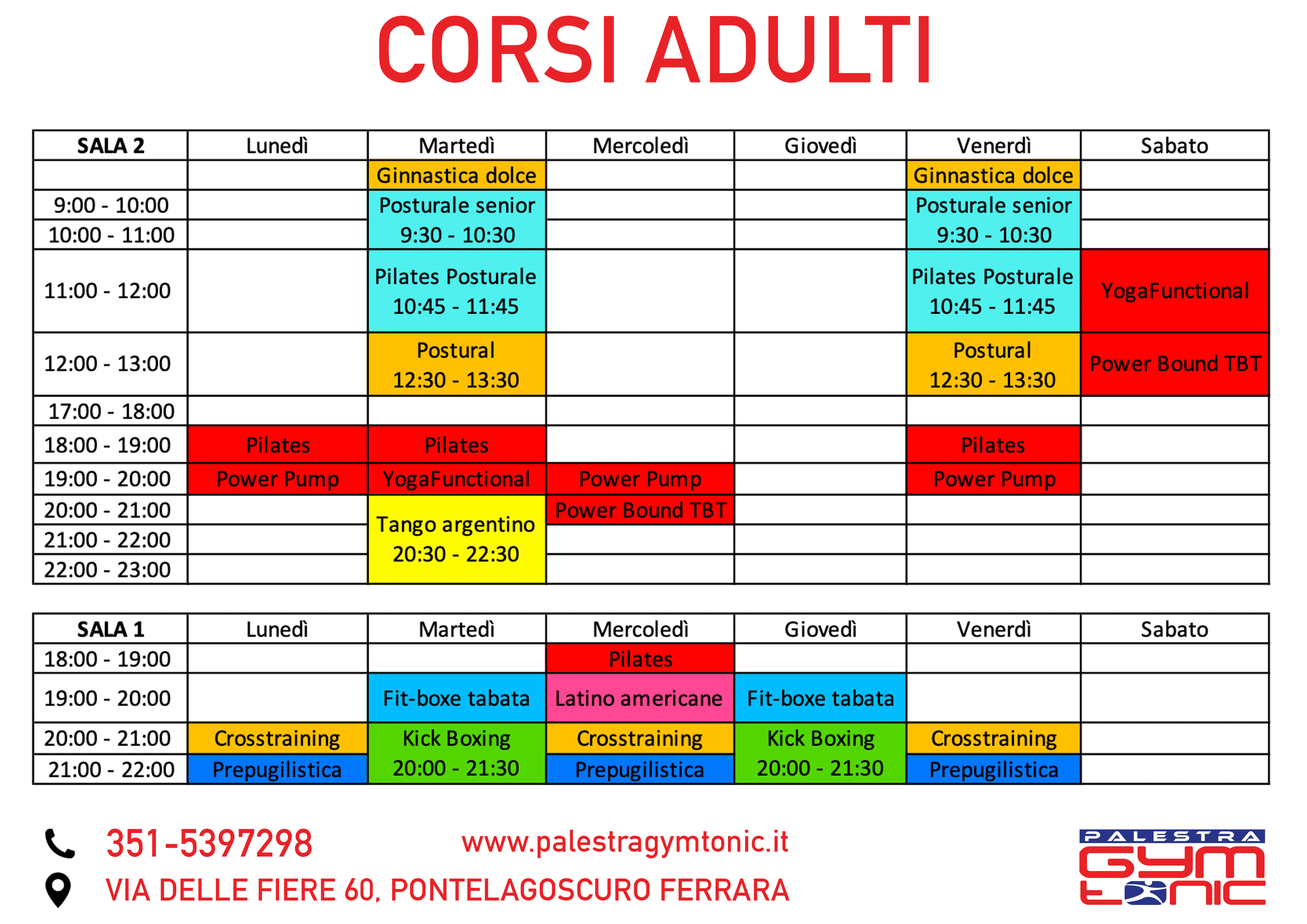 Benvenuti alla nostra selezione di corsi per adulti, progettati per soddisfare ogni esigenza di fitness e benessere. Offriamo una vasta gamma di opzioni, tra cui Pilates, Yoga-Functional, Power Pump, Power Bound, Ginnastica dolce, Posturale senior, Cross Training, e Fit Boxe Tabata, Tango Argentino e Danze Latino Americane. Che tu stia cercando una pratica tranquilla o un allenamento ad alta intensità, abbiamo il corso perfetto per te. Unisciti a noi oggi e inizia il tuo viaggio verso una vita più sana e attiva!